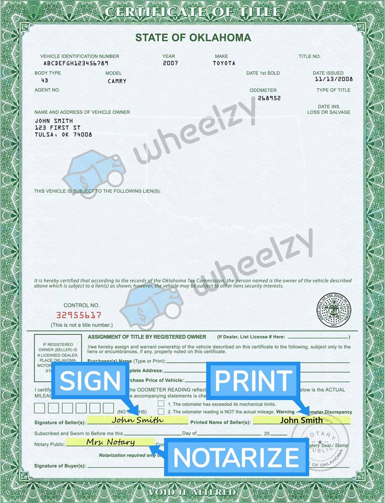 If your Edmond title shows a lien or a bank name printed on the front, then your title will need to be signed off by the lien holder or have a separate lien release letter.